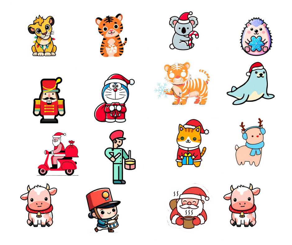 This pack includes a delightful mix of cartoon tigers, koalas, deer, cats, cows, seals, Santa on a scooter, nutcracker characters, and more—all wearing festive Christmas accessories. Every design is created to be bright, cheerful, and appealing for kids and families.